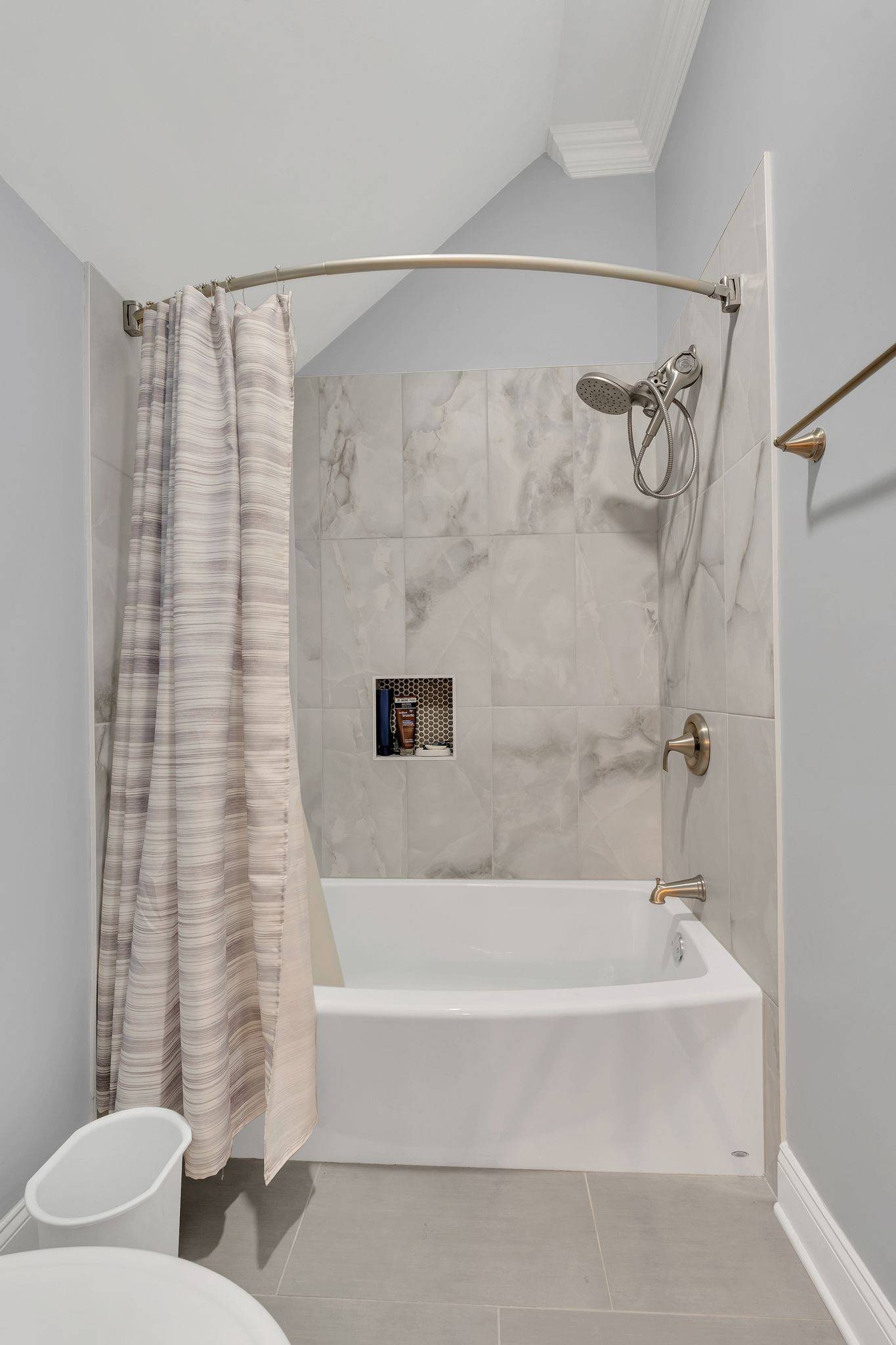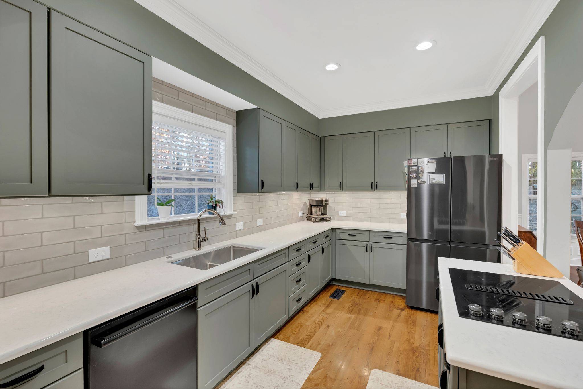 The recently updated kitchen has plenty of surface area with sleek new cabinetry, quartz countertops, and a large walk-in pantry. Throughout the main floor, you'll find beautiful sanded and refinished hardwood floors. A vaulted ceiling gives the primary bedroom a dramatic, open feel as you move into the beautifully updated bathroom, complete with a quartz double vanity, fully tiled roll-in shower, and a spacious walk-in closet.